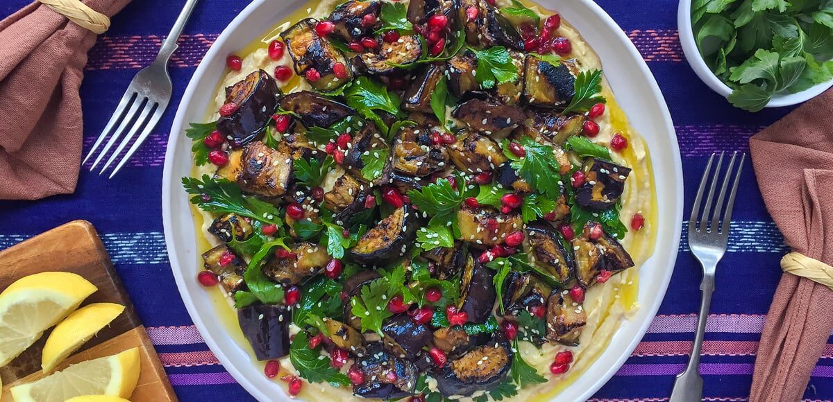 This grilled eggplant and pomegranate salad with whipped feta is a celebration of textures, colors, and aromas inspired by the Levant.