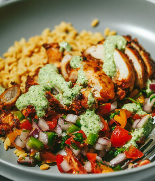 This recipe is built around balance: protein, grains, vegetables, sauce, and garnishes.