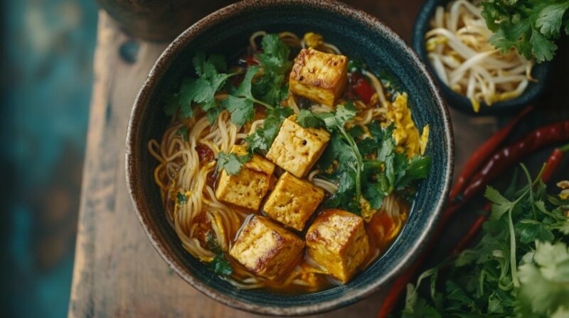 Topped with delightfully crunchy spiced chickpeas, soft-boiled eggs, fresh herbs, and vibrant vegetables, this ramen is both hearty and health-forward.
