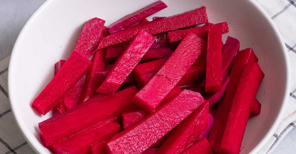 Pickled red turnips, often served alongside sandwiches like bahn mi or in mezze platters, bring a vibrant color and sharp flavor.